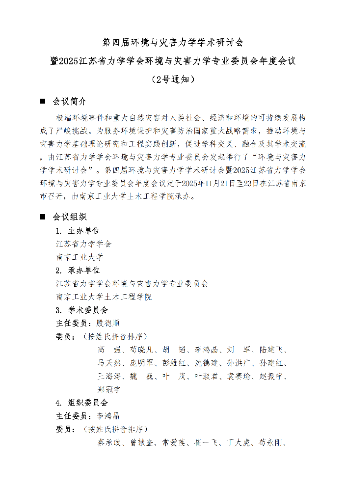 第四届环境与灾害力学学术研讨会 暨2025江苏省力学学会环境与灾害力学专业委员会年度会议 (2号通知)