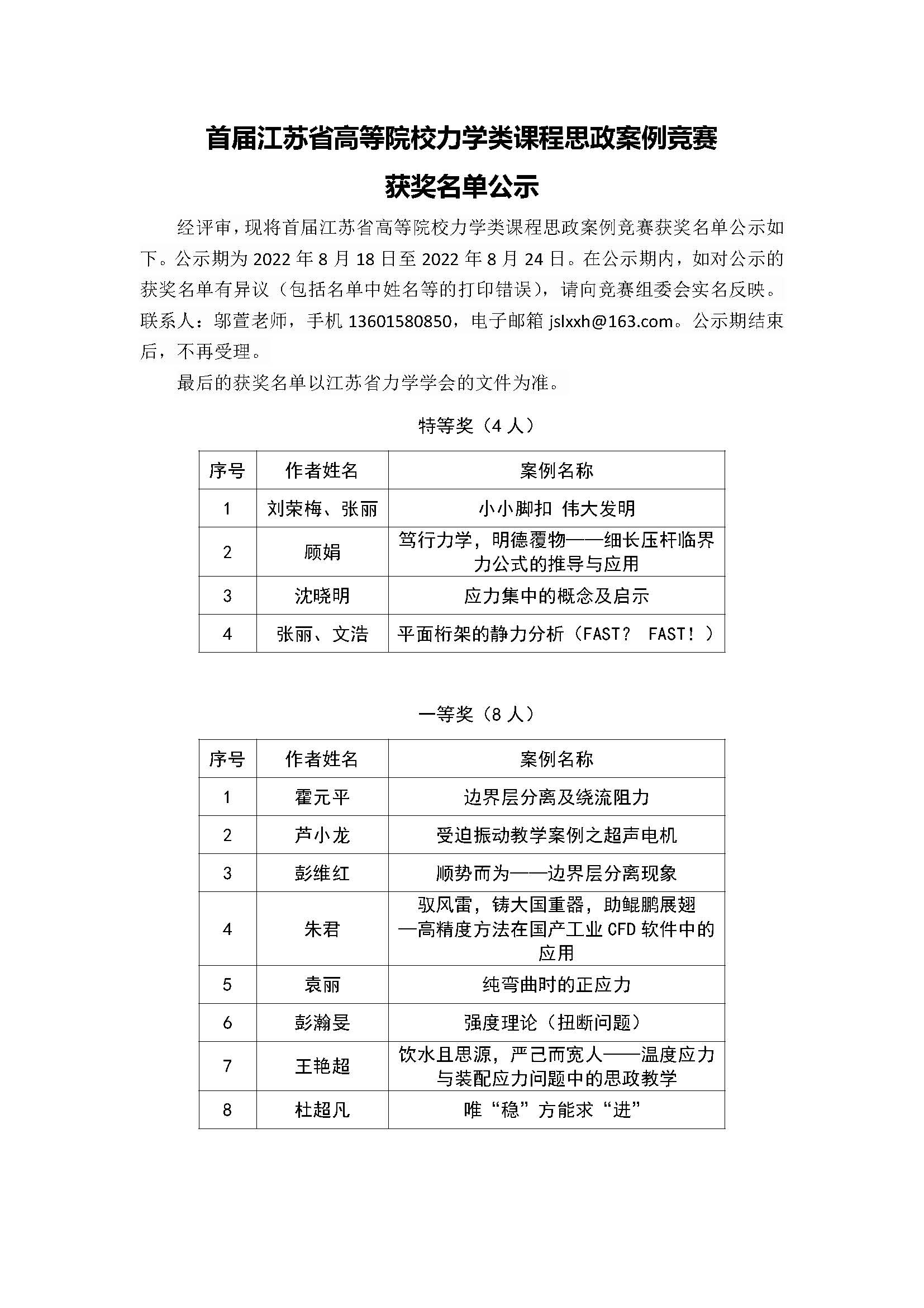 关于公布第十一届江苏省工科基础力学青年教师讲课竞赛获奖名单的通知
